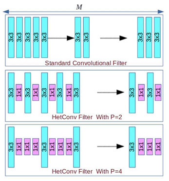 HetConv 是在2019年CVPR提出的一種新的高效卷積方式,它在CIFAR10、ImageNet等數(shù)據(jù)集超過(guò)了標(biāo)準(zhǔn)卷積以及DW+PW的高效卷積組合形式,取得了更高的分類性能。HetConv 主要側(cè)重于設(shè)計(jì)新的卷積核,傳統(tǒng)的卷積和按文中說(shuō)法稱為同構(gòu)卷積(homogeneousconvolution),即該過(guò)濾器包含的所有卷積核都是同樣大?。ū热缭?3 × 3 × 256CONV2D 過(guò)濾器中,所有 256 個(gè)核都是 3×3 大小),HetConv 是異構(gòu)卷積(heterogeneous convolution), 即過(guò)濾器包含不同大小的卷積核(比如在某個(gè) HetCOnv 過(guò)濾器中,256 核有的是 3×3 大小,其余的是 1×1 大小,由參數(shù)P控制 1×1 卷積核的數(shù)量)。