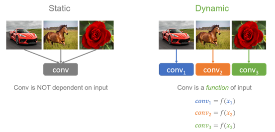 Dynamic Convolution是微軟AI在CVPR2020提出的高性能漲點(diǎn)的動(dòng)態(tài)卷積。動(dòng)態(tài)卷積這種新的設(shè)計(jì)能夠在不增加網(wǎng)絡(luò)深度或?qū)挾鹊那闆r下增加模型的表達(dá)能力(representation capacity)。動(dòng)態(tài)卷積的基本思路就是根據(jù)輸入圖像,自適應(yīng)地調(diào)整卷積參數(shù)。如圖1所示,靜態(tài)卷積用同一個(gè)卷積核對(duì)所有的輸入圖像做相同的操作,而動(dòng)態(tài)卷積會(huì)對(duì)不同的圖像(如汽車、馬、花)做出調(diào)整,用更適合的卷積參數(shù)進(jìn)行處理。簡(jiǎn)單地來(lái)說(shuō),卷積核是輸入的函數(shù)。