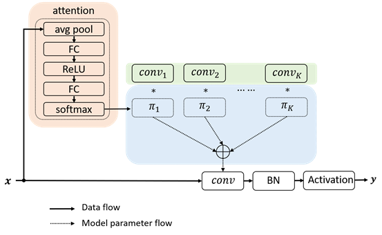 動(dòng)態(tài)卷積沒(méi)有在每層上使用單個(gè)卷積核,而是根據(jù)注意力動(dòng)態(tài)地聚合多個(gè)并行卷積核。注意力會(huì)根據(jù)輸入動(dòng)態(tài)地調(diào)整每個(gè)卷積核的權(quán)重,從而生成自適應(yīng)的動(dòng)態(tài)卷積。由于注意力是輸入的函數(shù),動(dòng)態(tài)卷積不再是一個(gè)線性函數(shù)。通過(guò)注意力以非線性方式疊加卷積核具有更強(qiáng)的表示能力。