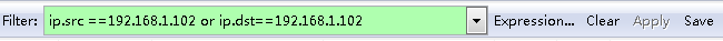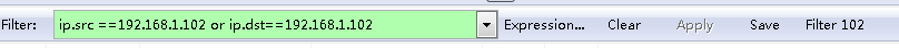 | ip.src ==192.168.1.102 or ip.dst==192.168.1.102 | 源地址或者目標(biāo)地址是192.168.1.102 |