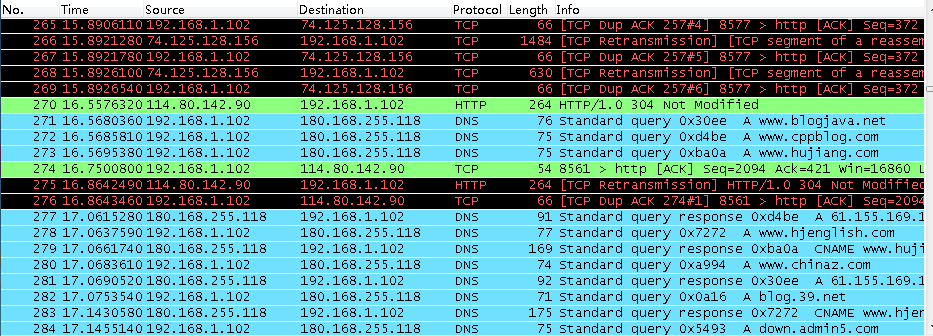 封包列表的面板中顯示,編號,時間戳,源地址,目標(biāo)地址,協(xié)議,長度,以及封包信息。 你可以看到不同的協(xié)議用了不同的顏色顯示。