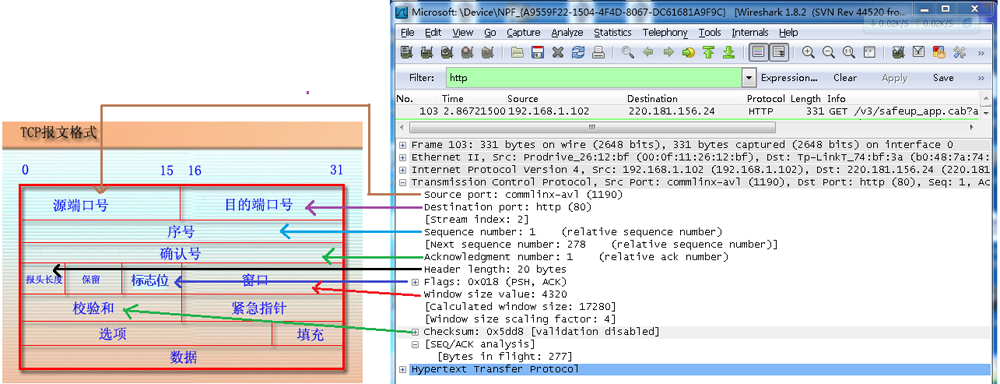 從下圖可以看到wireshark捕獲到的TCP包中的每個字段。