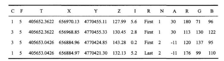 · LAS 是激光雷達(dá)數(shù)據(jù)(LiDAR),存儲格式比 pts 復(fù)雜,旨在提供一種開放的格式標(biāo)準(zhǔn),允許不同的硬件和軟件提供商輸出可互操作的統(tǒng)一格式。LAS 格式點云截圖,其中 C:class(所屬類),F(xiàn):flight(航線號),T:time(GPS 時間),I:intensity(回波強度),R:return(第幾次回波),N:number of return(回波次數(shù)),A:scan angle(掃描角),RGB:red green blue(RGB 顏色值)。