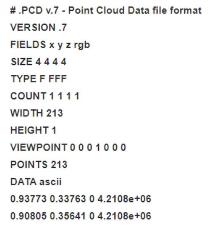· PCD 存儲格式,現(xiàn)有的文件結(jié)構(gòu)因本身組成的原因不支持由 PCL 庫(后文會進行介紹)引進 n 維點類型機制處理過程中的某些擴展,而 PCD 文件格式能夠很好地補足這一點。PCD 格式具有文件頭,用于描繪點云的整體信息:定義數(shù)字的可讀頭、尺寸、點云的維數(shù)和數(shù)據(jù)類型;一種數(shù)據(jù)段,可以是 ASCII 碼或二進制碼。數(shù)據(jù)本體部分由點的笛卡爾坐標(biāo)構(gòu)成,文本模式下以空格做分隔符。