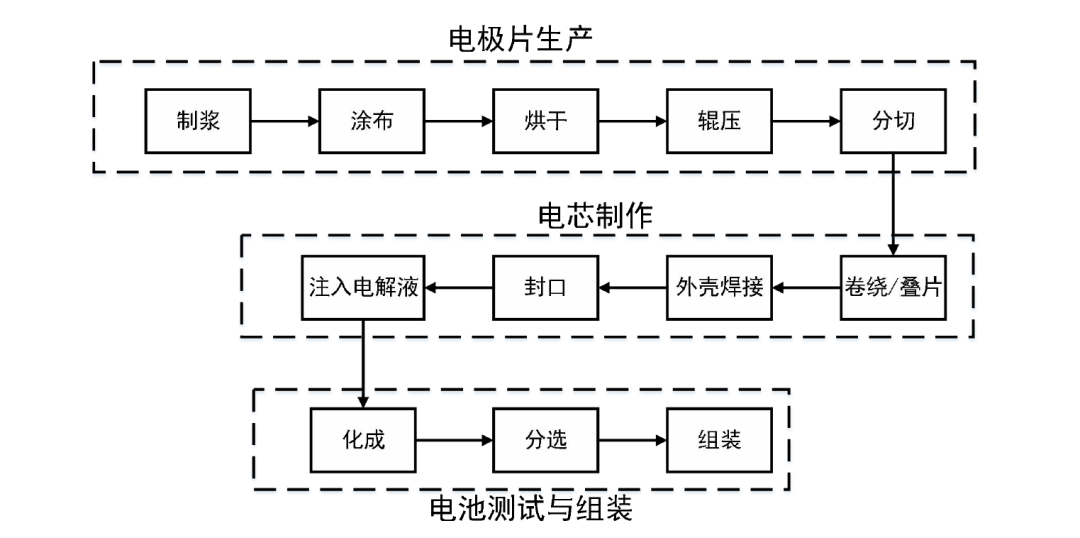 在實(shí)際工業(yè)生產(chǎn)中,鋰離子電池的生產(chǎn)過程主要可分為三大階段:電極片生產(chǎn)階段,電芯制作階段和電池測試與組裝階段,而每一階段又包含多道工藝步驟。