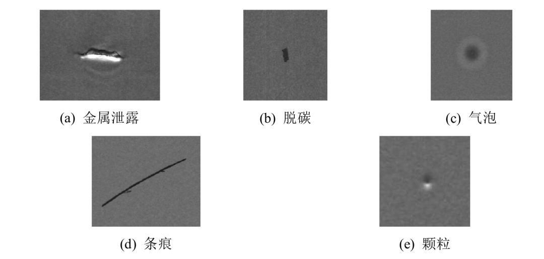 鋰電池電極片整個(gè)的生產(chǎn)工藝流程是十分復(fù)雜的,每一道工藝步驟都有嚴(yán)格的要求,任何一道工藝步驟出現(xiàn)問題,都有可能導(dǎo)致生產(chǎn)出的電極片存在各種各樣的缺陷,從而影響后續(xù)生產(chǎn)出的鋰離子電池的質(zhì)量。根據(jù)對(duì)采集到的實(shí)際工業(yè)生產(chǎn)中鋰電池電極片表面圖像的分析,本文將常見的鋰電池電極片表面存在的缺陷分為五類,分別為金屬泄露、脫碳、氣泡、條痕和顆粒。