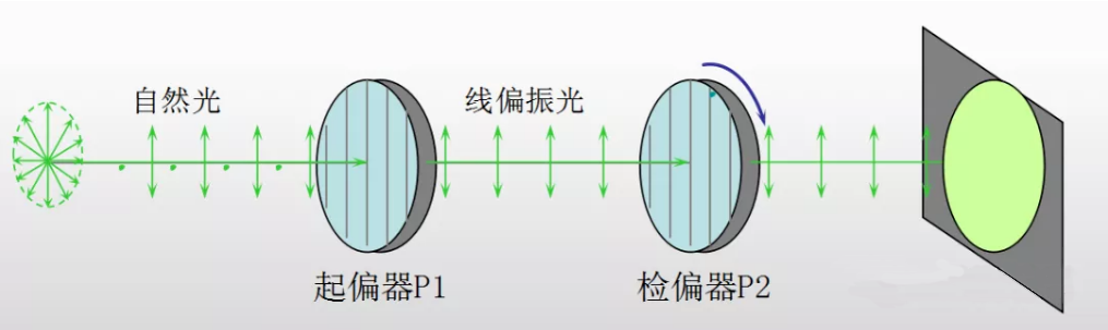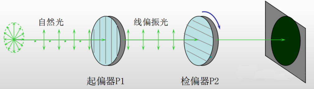 為了更好地理解光的偏振現(xiàn)象,我們可以借助實(shí)驗(yàn)裝置進(jìn)行生動地闡述。在圖3、圖4中,P1(起偏器)、P2(檢偏器)是兩塊同樣的偏振片。在圖3中,自然光(如燈光或陽光)通過偏振片P1后,形成了偏振光。但由于人的眼睛沒有辨別偏振光的能力,故無法察覺。