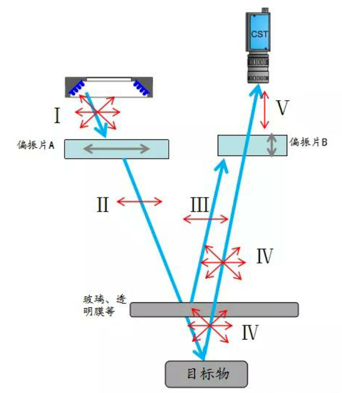這里以透明包裝膜內(nèi)的工件檢測為例,闡述一下偏光光源的光路原理。如圖7所示,由光源發(fā)出的光Ⅰ經(jīng)過偏光片A得到如光Ⅱ的線偏振光。光Ⅱ遇到包裝膜時(shí)部分會發(fā)生鏡面反射,即產(chǎn)生光Ⅲ,同時(shí)部分會透射至目標(biāo)物表面并形成漫反射光Ⅳ。此時(shí)光Ⅳ經(jīng)過目標(biāo)物的反射,振動方向發(fā)生變化,再透過玻璃面時(shí)偏光狀態(tài)仍然混亂,變成非偏振光。 在光Ⅲ和光Ⅳ中,光Ⅳ可透過偏光片B,變?yōu)楣猗酰ㄆ窆猓┎⒌竭_(dá)相機(jī)的CCD,但只含單方向偏光成分的光Ⅲ會被偏光鏡B擋住而不通過,因此可去除玻璃或者透明膜上的鏡面反光,輕松提取目標(biāo)物上的特征信息。