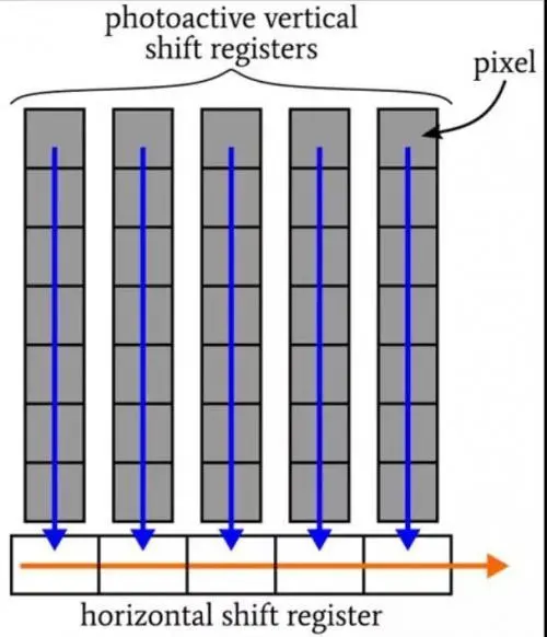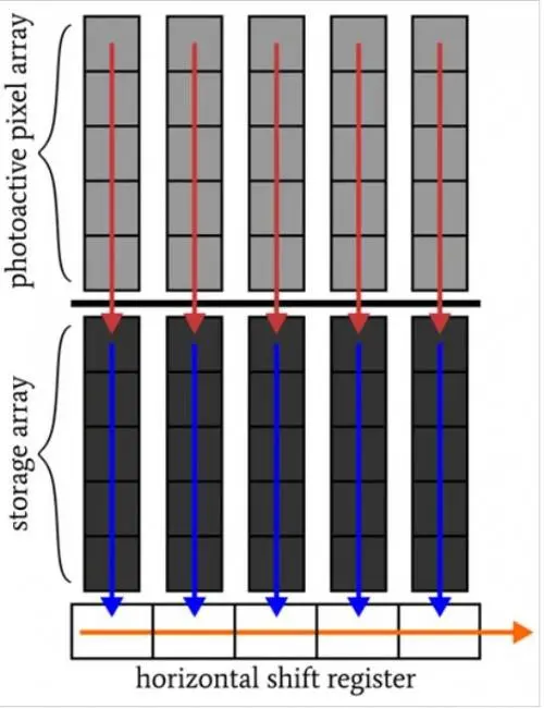 我們需要的最后一個主要的架構(gòu)改進是將集成電荷快速轉(zhuǎn)移到存儲區(qū)域,從而將污跡降低到可以忽略的程度。線間傳輸 CCD 通過提供與每個光活動位置相鄰的存儲(和傳輸)區(qū)域的網(wǎng)絡(luò)來實現(xiàn)這一點。曝光完成后,傳感器中的每個電荷包同時傳輸?shù)椒枪饷舸怪币莆患拇嫫髦小?/p>