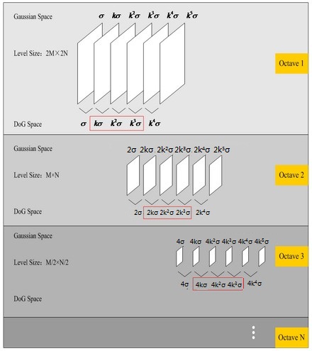 從上式可以知道,將相鄰的兩個(gè)高斯空間的圖像相減就得到了DoG的響應(yīng)圖像。為了得到DoG圖像,先要構(gòu)建高斯尺度空間,而高斯的尺度空間可以在圖像金字塔降采樣的基礎(chǔ)上加上高斯濾波得到,也就是對圖像金字塔的每層圖像使用不同的參數(shù)