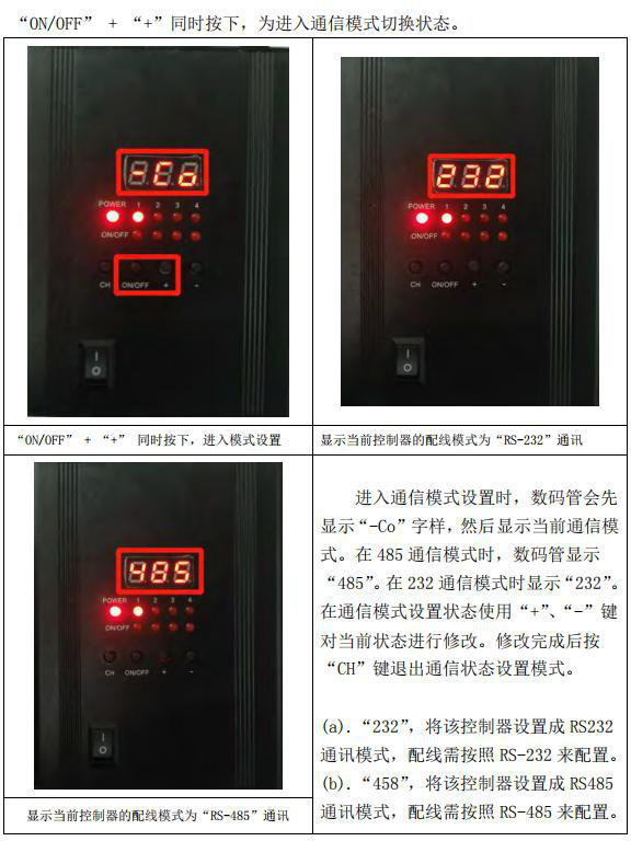 2、將SY-DL4CH-CV-24-C-GL光源控制器通訊模式設(shè)置成 485 模式,設(shè)置方法如下: