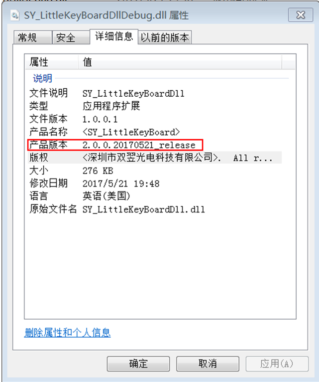 如:SY_LittleKeyBoardDll.dll該軟件的版本號為:2.0.0.20170521_release,表明該軟件為20170521編譯,軟件為最終正式版本。