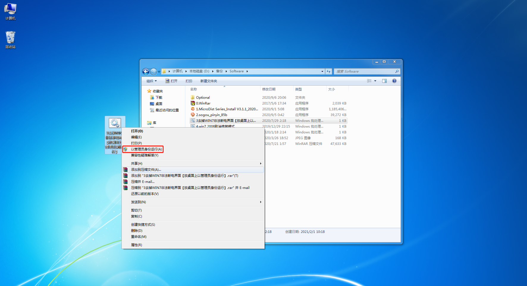 將文件“3.去掉WIN7非法斷電界面【放桌面上以管理員身份運(yùn)行】.bat”拷貝到桌面。