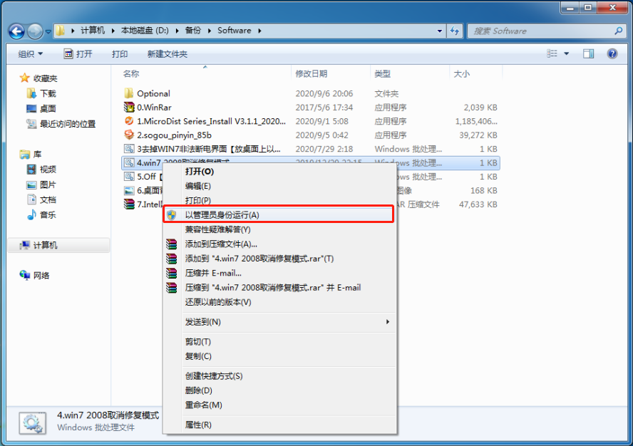 右鍵單擊文件“4.win7 2008取消修復(fù)模式.bat”。