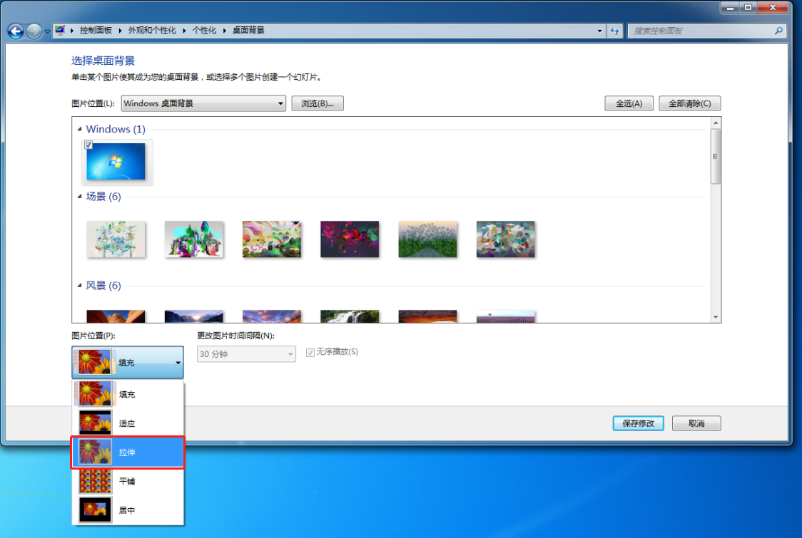 在“圖片位置”選項中選擇“拉伸”