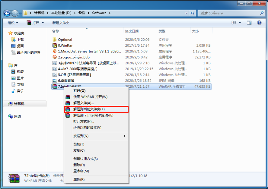 右鍵單擊文件“8.Intel網(wǎng)卡驅(qū)動.rar”。