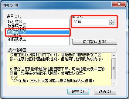 →將“接收緩沖區(qū)”的值修改為最大值,圖中最大值為“2048”