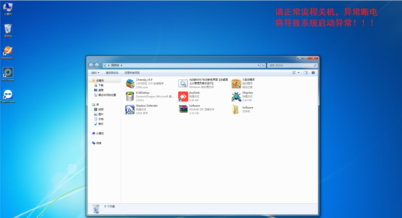 將不常用的桌面圖標(biāo)刪除并清空回收站,最終預(yù)留“計算機(jī)”、“回收站”、“視覺軟件”、“MVViewer”、“TeamViewer”等圖標(biāo)。如果有9014運(yùn)動控制卡,則保留9014運(yùn)動控制卡Demo的快捷方式。