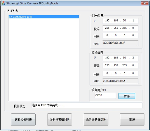 5) 填寫相機(jī)IP地址(默認(rèn)192.168.50.2為CCD0,192.168.51.2為CCD1,以此類推),點擊強(qiáng)制設(shè)置臨時IP,系統(tǒng)會顯示強(qiáng)制設(shè)置臨時IP完成……
