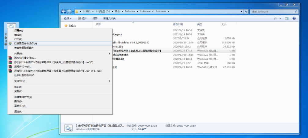 右鍵單擊“4去掉WIN7非法斷電界面【放桌面上以管理員身份運行】.bat”文件。