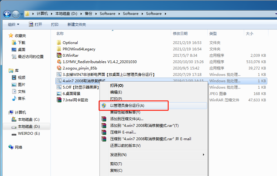 右鍵單擊文件“5.win7 2008取消修復模式.bat”。