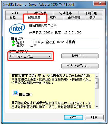 →將“鏈接速度”選項卡中的“速度和雙工”屬性,修改為“1.0 Gbps 全雙工”