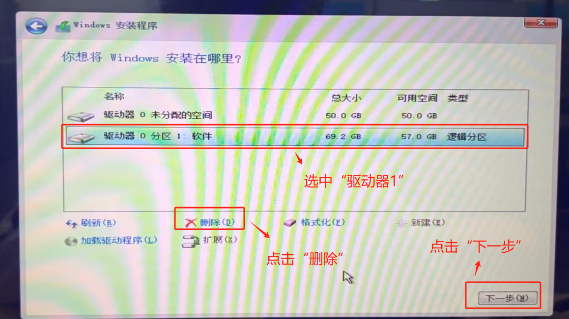 選中“驅(qū)動(dòng)器0分區(qū)1:軟件”,點(diǎn)擊“刪除”,點(diǎn)擊“下一步”