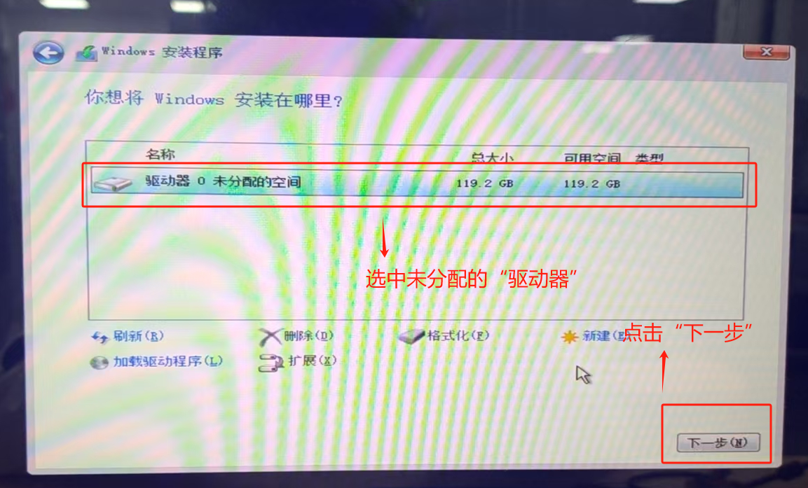 選中“驅(qū)動(dòng)器0未分配的空間”,點(diǎn)擊“下一步”