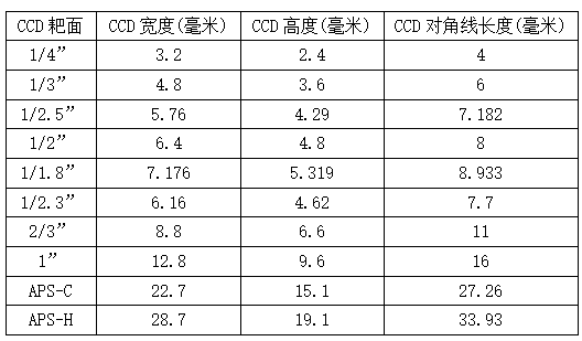 CCD攝像機(jī)靶面對(duì)角線有效尺寸