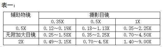 光學(xué)放大倍率 = 變倍主物鏡放大率(0.7X~4.5X)×攝影目鏡放大率×附加大物鏡放大率(見(jiàn)表一)