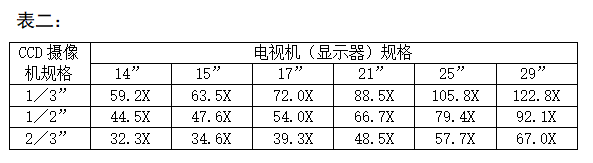 數(shù)字放大倍數(shù) = 監(jiān)視器尺寸 * 25.4/CCD或CMOS靶面尺寸(即對(duì)角線尺寸大小) ;(1英寸=25.4mm)(見(jiàn)表二)