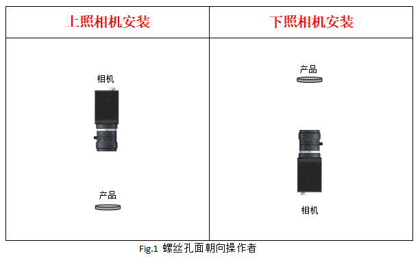 相機(jī)的安裝方向:以操作者站立調(diào)試的位置為基準(zhǔn)(一般就是顯示器的位置),相機(jī)的螺絲孔面朝向操作者,標(biāo)簽面(即正面)遠(yuǎn)離操作者。這樣才能保證實(shí)際圖像和顯示器圖像保持一致性,方便調(diào)試。