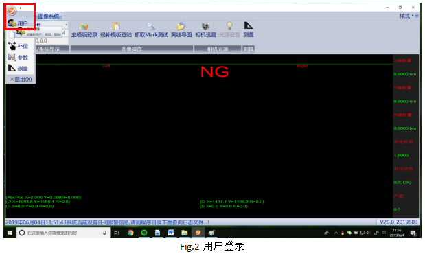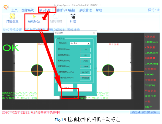 控軸軟件,系統(tǒng)全體停止的狀態(tài)下,點(diǎn)擊下圖所示的系統(tǒng)標(biāo)定按鈕,彈出標(biāo)定界面,點(diǎn)擊啟動標(biāo)定,系統(tǒng)將控制平臺移動和相機(jī)拍照,標(biāo)定時觀察圖像抓點(diǎn)情況,不能出現(xiàn)抓錯、抓偏位。系統(tǒng)提示標(biāo)定完成即完成標(biāo)定。