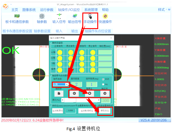 設(shè)置待機(jī)位之前需要啟動復(fù)位進(jìn)行平臺回零,回零完成后點(diǎn)擊“軸操作/IO監(jiān)控”->“手動操作”彈出軸操作界面,選擇X1軸,填寫點(diǎn)動距離,通過手動點(diǎn)擊正反轉(zhuǎn)操控X1軸到限位中間位置,最后點(diǎn)“保存點(diǎn)位”。同理設(shè)定X2軸和Y軸的待機(jī)位置,如此便完成了對位平臺待機(jī)位的設(shè)定。