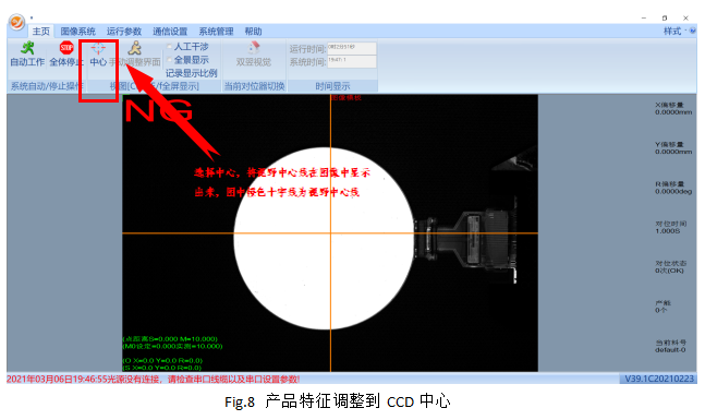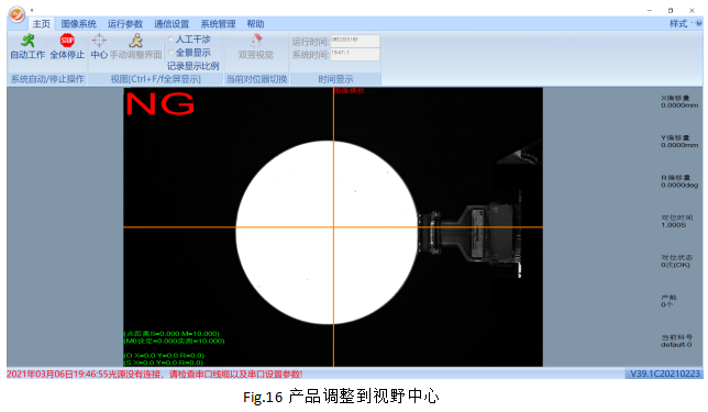 軟件上點(diǎn)擊中心,在圖像中可以看到橙色的十字線,這個為視野中心,在產(chǎn)品上料過程中,我們需要將產(chǎn)品放置到橙色十字交點(diǎn)即視野中心位置。