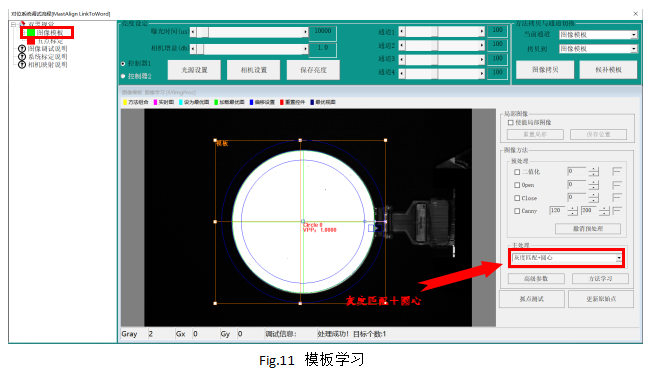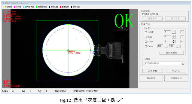 ? Step2:如圖11所示,下拉重新選擇“灰度匹配+圓心”,黃色的模板框工具和藍(lán)色的圓工具則會顯示出來,通過拖拽調(diào)整先使圓工具的中心圓與產(chǎn)品的邊緣相接,然后調(diào)整模板框位置和大小到合適。如圖12所示,再點(diǎn)擊“方法學(xué)習(xí)”,則學(xué)習(xí)記錄當(dāng)前的模板。注意圓工具的極性和找邊方向。