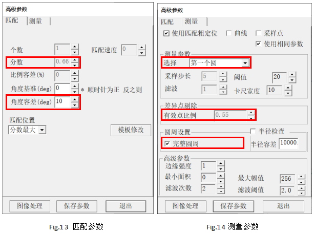 ? Step3:調(diào)整高級參數(shù)。點(diǎn)擊“高級參數(shù)”,進(jìn)入高級參數(shù)界面,調(diào)整參數(shù)如下圖13與圖14。可根據(jù)實(shí)際情況修改“分?jǐn)?shù)”、“角度容差”、 “有效點(diǎn)比例”、“完整圓周”等參數(shù)。