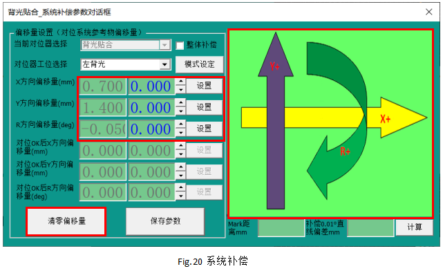 根據(jù)補(bǔ)償方向圖示,在右側(cè)對應(yīng)的方向補(bǔ)償寫入補(bǔ)償數(shù)值后,點(diǎn)擊“設(shè)置”累加到左側(cè)的總補(bǔ)償參數(shù)中。設(shè)置完補(bǔ)償參數(shù)退出前必須要點(diǎn)擊“保存參數(shù)”,補(bǔ)償才能生效。