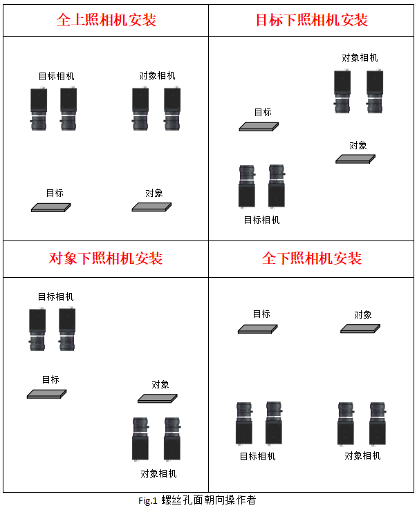 相機(jī)的安裝方向:以操作者站立調(diào)試的位置為基準(zhǔn)(一般就是顯示器的位置),相機(jī)的螺絲孔面朝向操作者,標(biāo)簽面(即正面)遠(yuǎn)離操作者。這樣才能保證實(shí)際圖像和顯示器圖像保持一致性,方便調(diào)試。