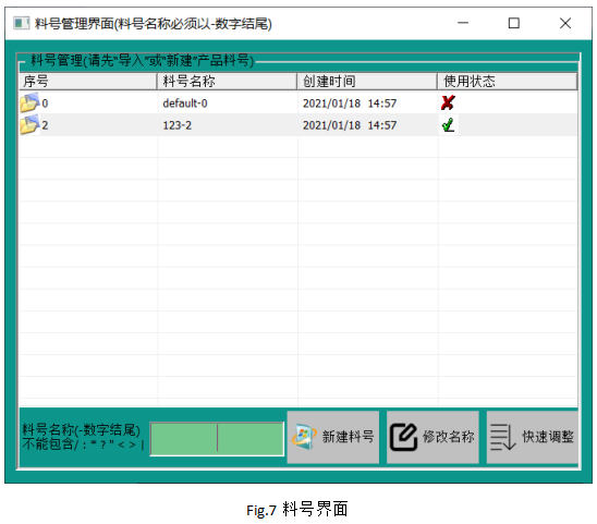 即為目前正在使用的料號(hào)。光標(biāo)在當(dāng)前料號(hào)時(shí)右鍵雙擊可刪除當(dāng)前料號(hào),左鍵雙擊即導(dǎo)入當(dāng)前料號(hào)。