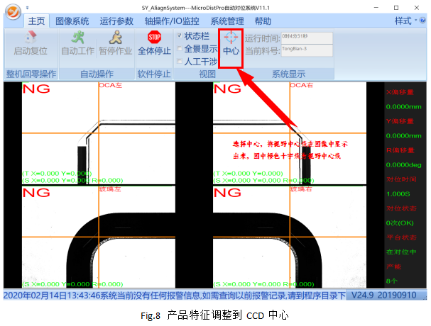 軟件上點(diǎn)擊中心,在圖像中可以看到橙色的十字線,這個(gè)為視野中心,在產(chǎn)品上料過(guò)程中,我們需要將產(chǎn)品放置到橙色十字交點(diǎn)即視野中心位置。