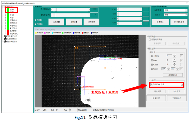 ? Step2:如圖11所示,下拉重新選擇“灰度匹配+雙直線”,黃色的模板框工具和藍(lán)色的直線工具則會(huì)顯示出來(lái),通過(guò)拖拽調(diào)整先使兩個(gè)直線工具的中線分別與產(chǎn)品的水平邊和垂直邊的邊緣相接,然后調(diào)整模板框位置和大小到合適。如圖12所示,再點(diǎn)擊“方法學(xué)習(xí)”,則學(xué)習(xí)記錄當(dāng)前的模板。注意直線工具的極性和找邊方向。