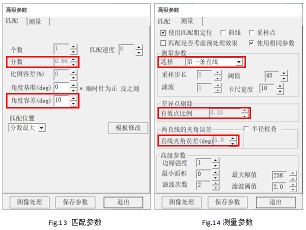 ? Step3:調(diào)整高級(jí)參數(shù)。點(diǎn)擊“高級(jí)參數(shù)”,進(jìn)入高級(jí)參數(shù)界面,調(diào)整參數(shù)如下圖13與圖14??筛鶕?jù)實(shí)際情況修改“分?jǐn)?shù)”、“角度容差”、 “有效點(diǎn)比例”、“直線夾角誤差”等參數(shù)。