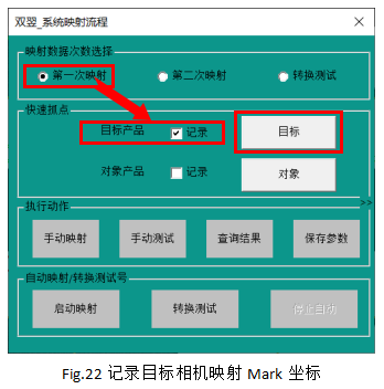 1) 系統(tǒng)全體停止的狀態(tài)下,將映射產(chǎn)品搬運(yùn)到目標(biāo)相機(jī)下,打開(kāi)映射界面,勾選第一次映射,再勾選目標(biāo)產(chǎn)品“記錄”,點(diǎn)擊“目標(biāo)”按鈕,系統(tǒng)會(huì)抓取Mark點(diǎn)的坐標(biāo)。