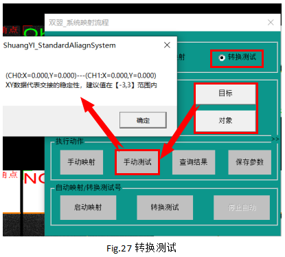 6) 勾選轉(zhuǎn)換測(cè)試,再做第三次交接,步驟同上,抓點(diǎn)OK后點(diǎn)擊手動(dòng)測(cè)試。CH數(shù)據(jù)需要在【-3~3】范圍內(nèi)才算映射合格。代表產(chǎn)品交接穩(wěn)定,否則需要檢查抓點(diǎn)問(wèn)題和機(jī)構(gòu)交接的穩(wěn)定性問(wèn)題。