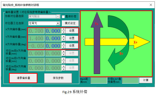 根據(jù)補(bǔ)償方向圖示,在右側(cè)對(duì)應(yīng)的方向補(bǔ)償寫入補(bǔ)償數(shù)值后,點(diǎn)擊“設(shè)置”累加到左側(cè)的總補(bǔ)償參數(shù)中。設(shè)置完補(bǔ)償參數(shù)退出前必須要點(diǎn)擊“保存參數(shù)”,補(bǔ)償才能生效。