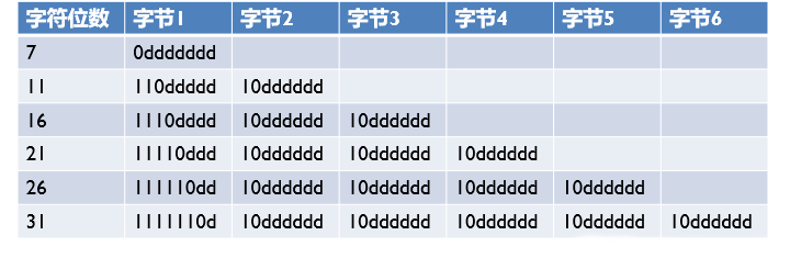 如圖所示,我們可以看到字節(jié)1中前面的數(shù)字本標(biāo)識字符的位數(shù),當(dāng)為0時表示7位,當(dāng)110時表示11位,然后字節(jié)1之后的所有字節(jié)均通過10開頭,這就是它的格式。