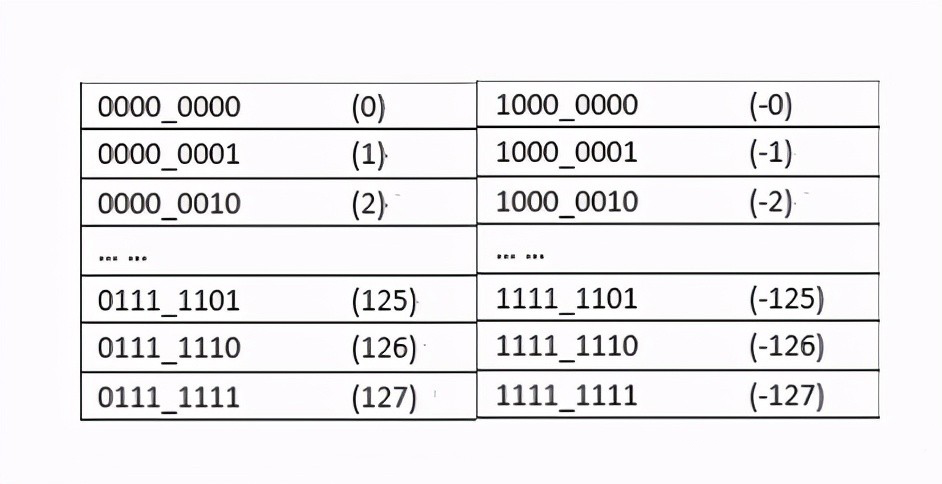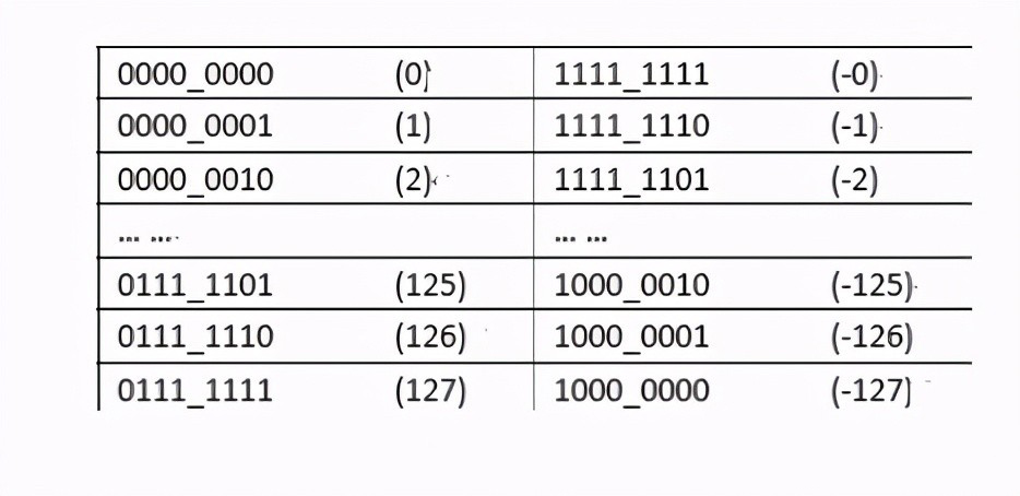 我們可以發(fā)現(xiàn)反碼滿足了負(fù)原碼中每增加一個二進(jìn)制單位對應(yīng)的是遞增的(1111_1110和1111_1111相比,1111_1111比1111_11110大),解決第一個問題之后,還有第二個問題,這個問題就是0的問題,因為沒有正0和負(fù)零的說法,但是上面確有正零和負(fù)零區(qū)別,這就導(dǎo)致了重復(fù)的問題,這個時候我們發(fā)現(xiàn)當(dāng)給負(fù)原碼加1,那么0就統(tǒng)一了,如下所示:
