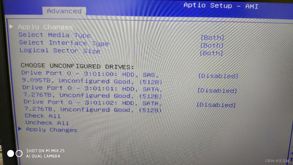 首先將設(shè)備都準(zhǔn)備好后,開(kāi)機(jī)進(jìn)入BIOS下,找到Advanced下的陣列卡信息