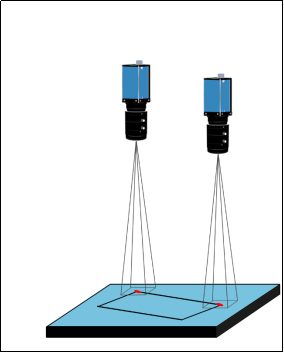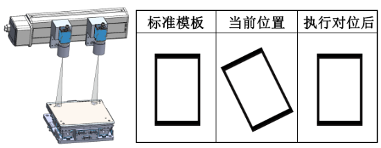 說明:雙相機模型兩個相機分別拍攝產(chǎn)品的兩個Mark點。平臺端的產(chǎn)品來料位置不固定,找出兩個Mark點后。根據(jù)糾偏算法找到偏移量,根據(jù)偏移量將平臺端的產(chǎn)品對位到基準位置上(絲印基準位置)。